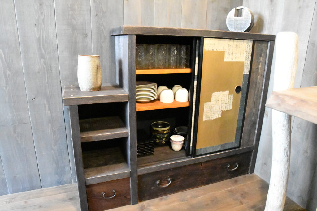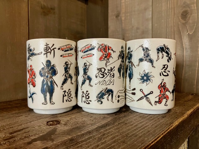 こちらは食器棚です。ひととおりの食器は揃っています。ここならでは!なのが、忍者デザインのお湯呑みです。思い出に写真に残してくださいね。